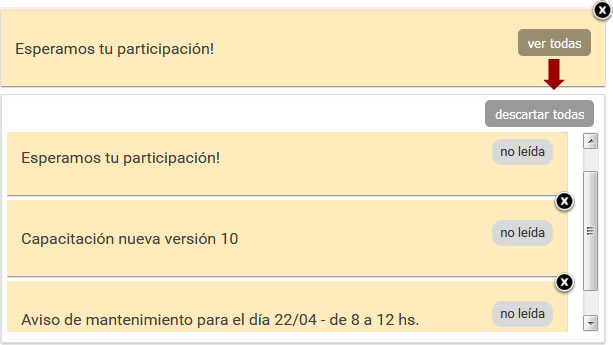 Las notificaciones no leídas se muestran de a una. Se observa primero la más reciente. El usuario puede optar por mostrar todas las notificaciones activas. Cuando el usuario abre la notificación se considerará leída mientras que si hace clic en la X (o en Descartar) dejará de mostrarse, pasando a ser visible la siguiente notificación no leída.