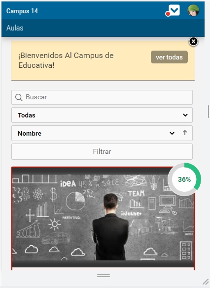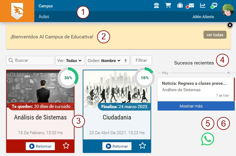 Una vez que ha ingresado su usuario y clave, será redireccionado siempre a Aulas. Éste entorno cumple la función de un Panel de control de las actividades del usuario en el campus.