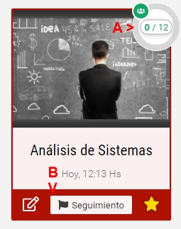 En el 3. Acceso a Aulas, el docente verá alertas y accesos rápidos en las aulas que está como responsable y dónde debe atender las realizaciones y tareas de los cursantes como ser los botones de cuantos han completado el curso sobre los anotados (A) y el botón de seguimiento si le corresponde.