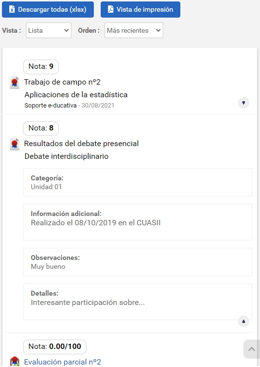 Se pueden obtener los reportes de las calificaciones correspondientes (propias o completas) según el permiso del usuario con la opción Descargar todas (entrega una planilla) o mostrar una Vista de impresión, que también posibilita guardarla en PDF.