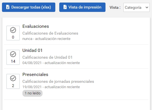 Un alumno o cursante, en general tendrá el permiso Ver Propio, con el cual sólo visualizar sus calificaciones personales provenientes de evaluaciones, actividades o agregadas manualmente de forma totalmente privada y confidencial. También puede descargar las calificaciones en una planilla de cálculo o disponer de una Vista de impresión, que también permite guardar como PDF.
