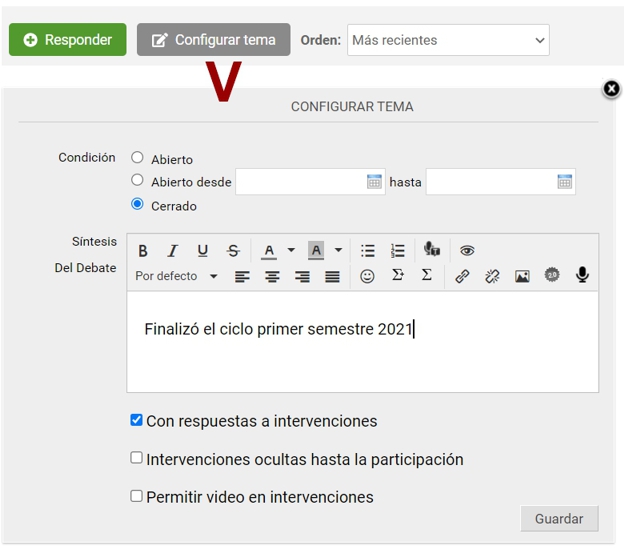 Deberá acceder al foro en cuestión y hacer clic en la columna derecha en Configurar tema, lo que nos permitirá modificar las fechas establecidas ó cerrarlo, pudiendo detallar una síntesis del debate.
