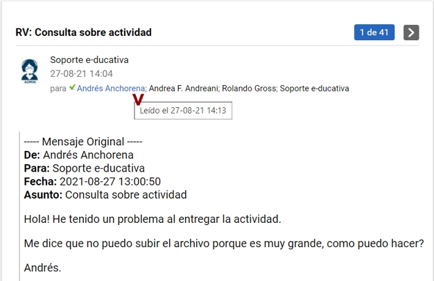 Al ingresar al detalle de un correo, podremos saber si el destinatario del mensaje lo ha leído (y en ese caso cuándo lo leyó) al posicionarnos sobre su nombre: