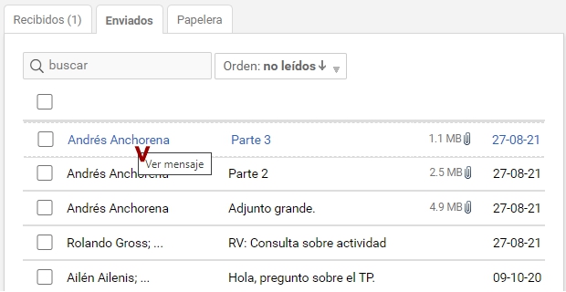 Desde esta carpeta, la cual contiene los correos que hemos escrito y enviado, podremos realizar las acciones previamente enumeradas para la carpeta Recibidos (excepto marcar un correo como No leído).
