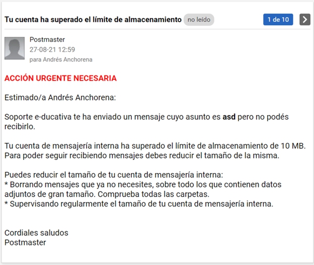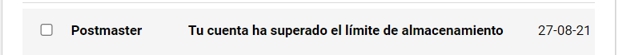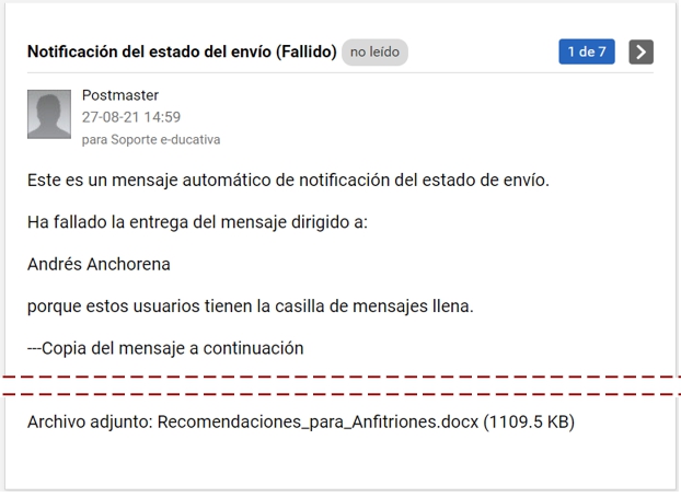 Mientras tanto, el usuario cuya casilla está llena, recibirá una notificación que cierto usuario quiso enviarle un mail y que debido a que el espacio de almacenamiento está completo no podrá ser recibido.