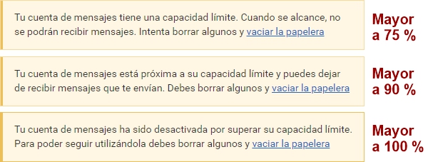 Cuando el porcentaje sobrepasa los 75% del total, el Mail Interno informa al usuario que una vez que la casilla está completa no recibirá más mensajes. Es sólo una advertencia para que el usuario realice una limpieza, y no deje de recibir los próximos correos que lleguen a su casilla.