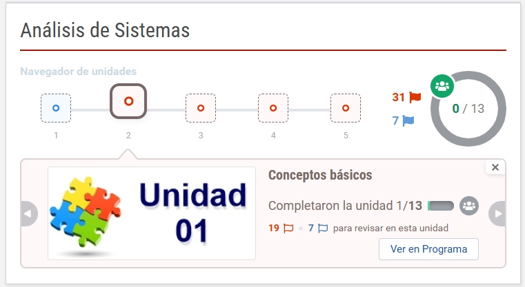 + Cantidad de cursantes que han completado el curso sobre el total, al hacer clic sobre la rueda, nos presenta la vista de seguimiento de Programa.