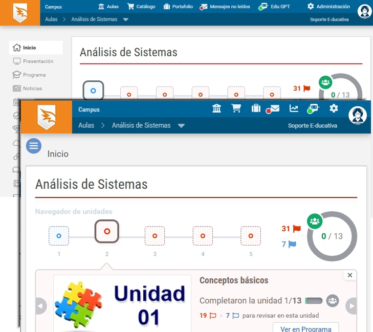 En la sección inicio, el usuario docente o tutor no verá su propio avance sino información sobre los usuarios cursantes:
