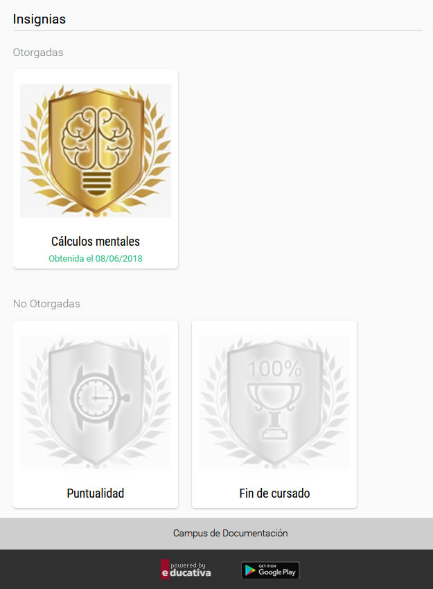 A ingresar se visualizan las insignias recibidas y las que aún no han sido otorgadas: