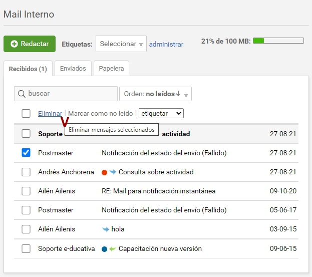 Todos los mensajes nuevos que recibas desde otros usuarios o mensajes del sistema, se guardarán en la carpeta Recibidos, y se indicará entre paréntesis el número de mensajes que aún no has leído. En el listado de mensajes los podrás identificar destacados en negrita.