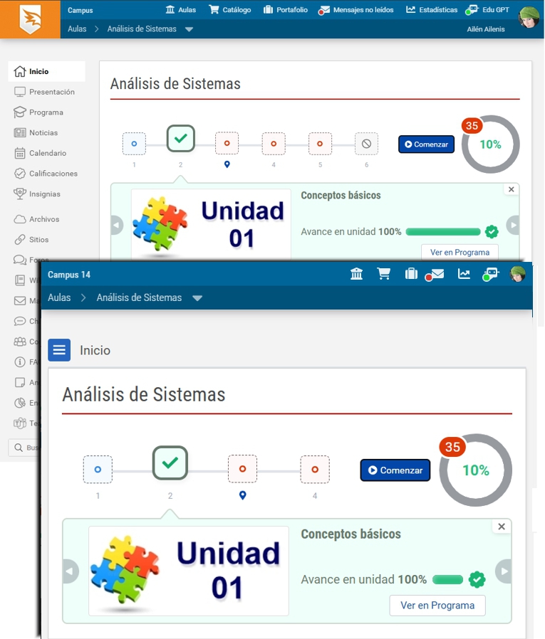 2. Secciones: las Secciones permiten un acceso rápido a los distintos contenidos y funciones del campus.