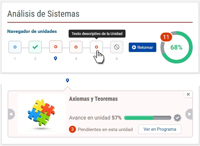 En el caso de la página inicial, se muestra un navegador de las unidades del curso, centrado en la última unidad accedida. Al hacer clic en cada unidad se muestra un detalle de la misma en el recuadro y sus contenidos pendientes. Además puedes Comenzar el cursado o Retomar desde el último material accedido. El botón es visible en todas las visitas al aula, hasta que efectivamente se haya interactuado con algún contenido del mismo para iniciar el cursado.