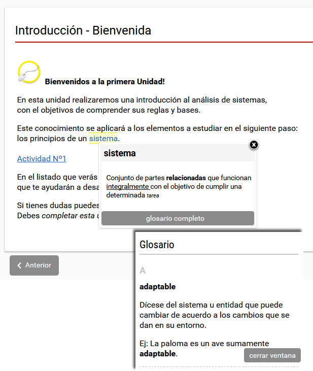 El Glosario incorpora una útil herramienta que funciona como un Diccionario. En él se definen términos o frases, con su definición. Estos términos se mostrarán resaltados y al posicionarse con el cursor sobre ellos se podrá ver la definición asignada.