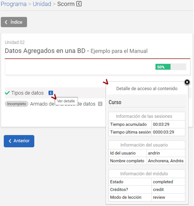 Los módulos ya navegados indican su estado y un detalle al hacer clic en la "i" a su lado.