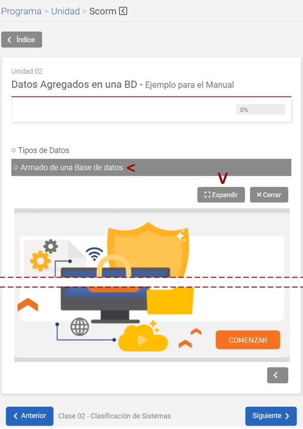 Al hacer clic sobre cada SCO (parte del SCORM) el mismo se abrirá incrustado debajo, aunque también puede verse en pantalla completa con Expandir.