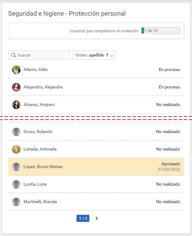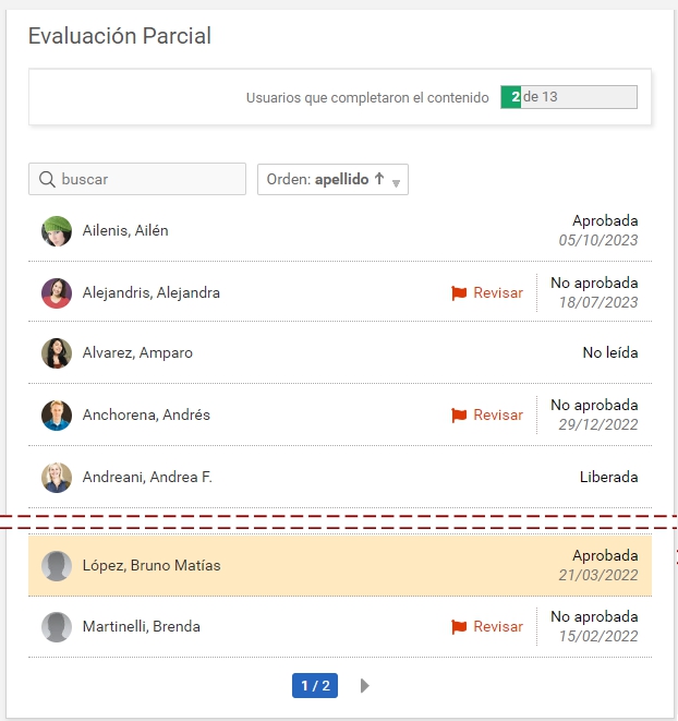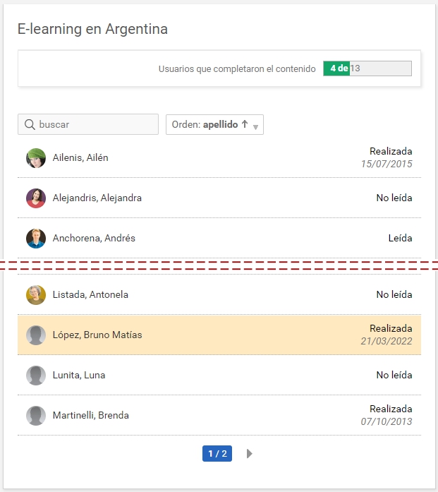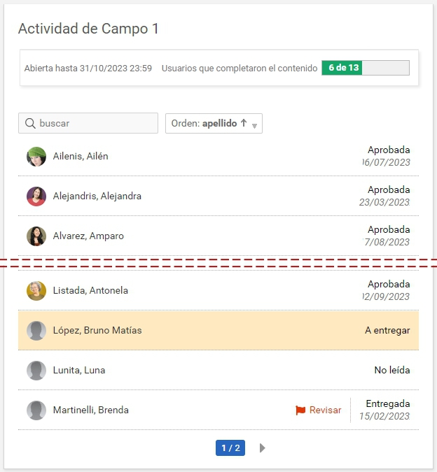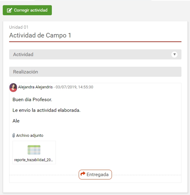 Si se encuentra realizada, es posible hacer clic en el nombre del alumno para ver su realización.