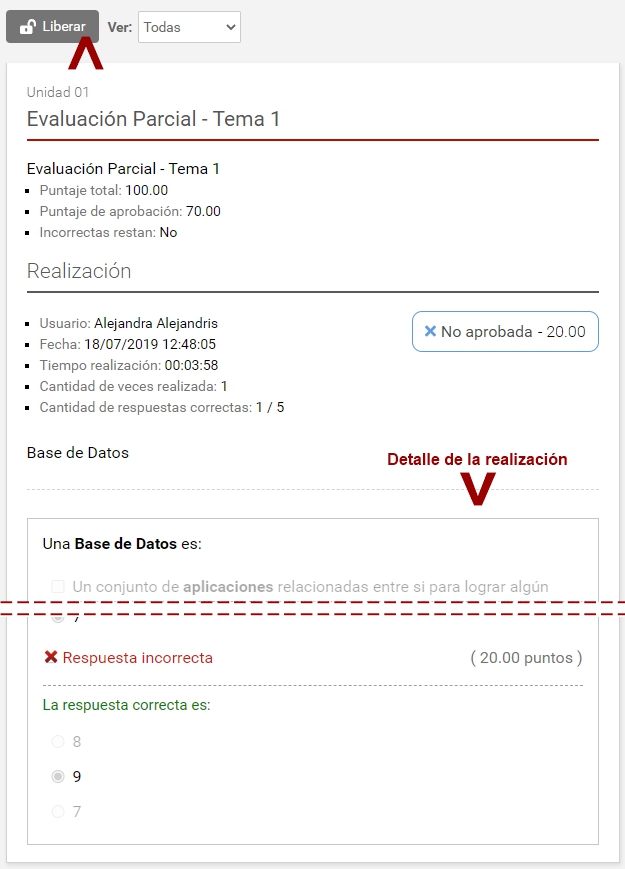 Al hacer clic sobre uno de los usuarios a revisar, accederemos a su realización, donde puede Liberarla de ser necesario para que el alumno vuelva a intentarlo.
