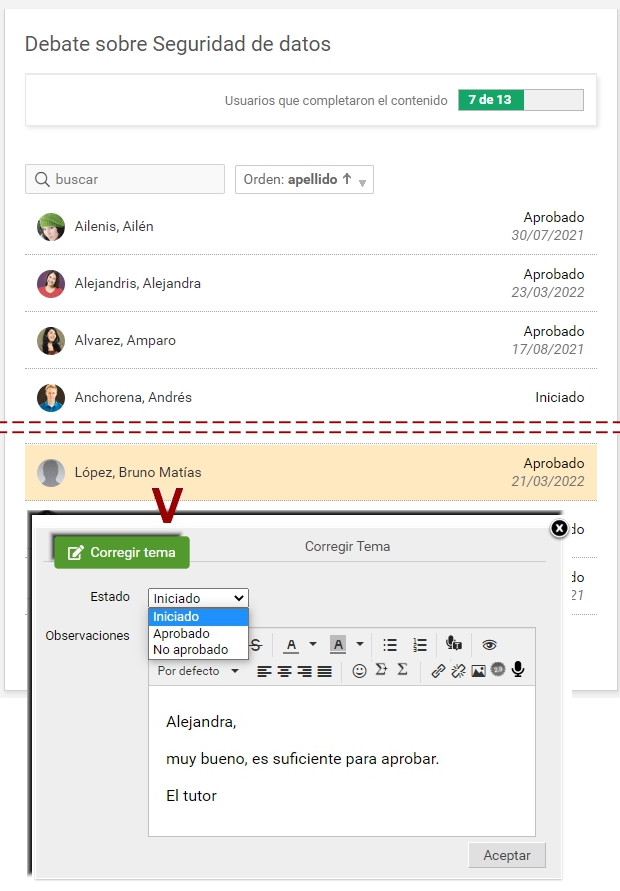 Por último, el docente puede corregir realizaciones de temas de debate cerrados, pero solo se permiten establecer los estados: Aprobado / No aprobado.