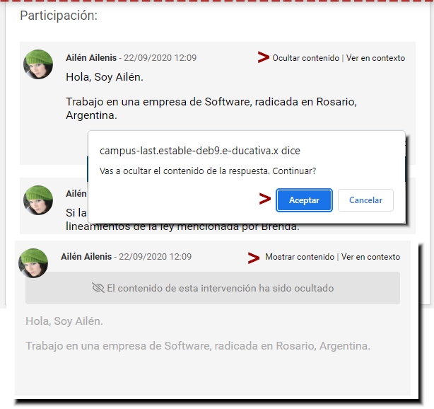 Finalmente, como docente o responsable puede controlarse la visualización de ciertos posts, con las opciones mostradas de Ocultar/Mostrar contenido: