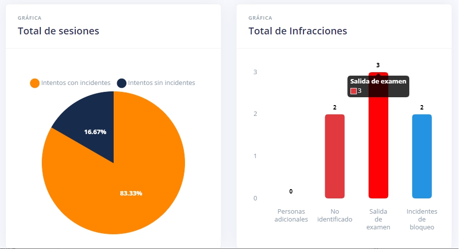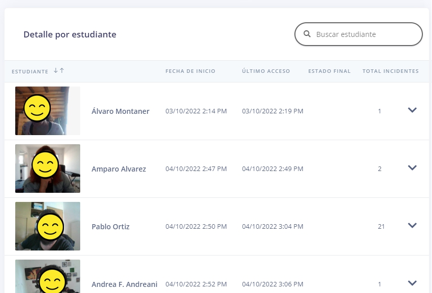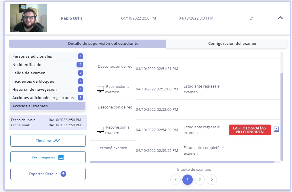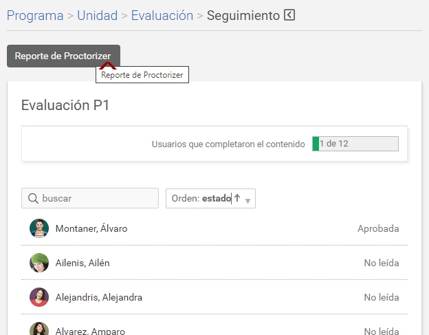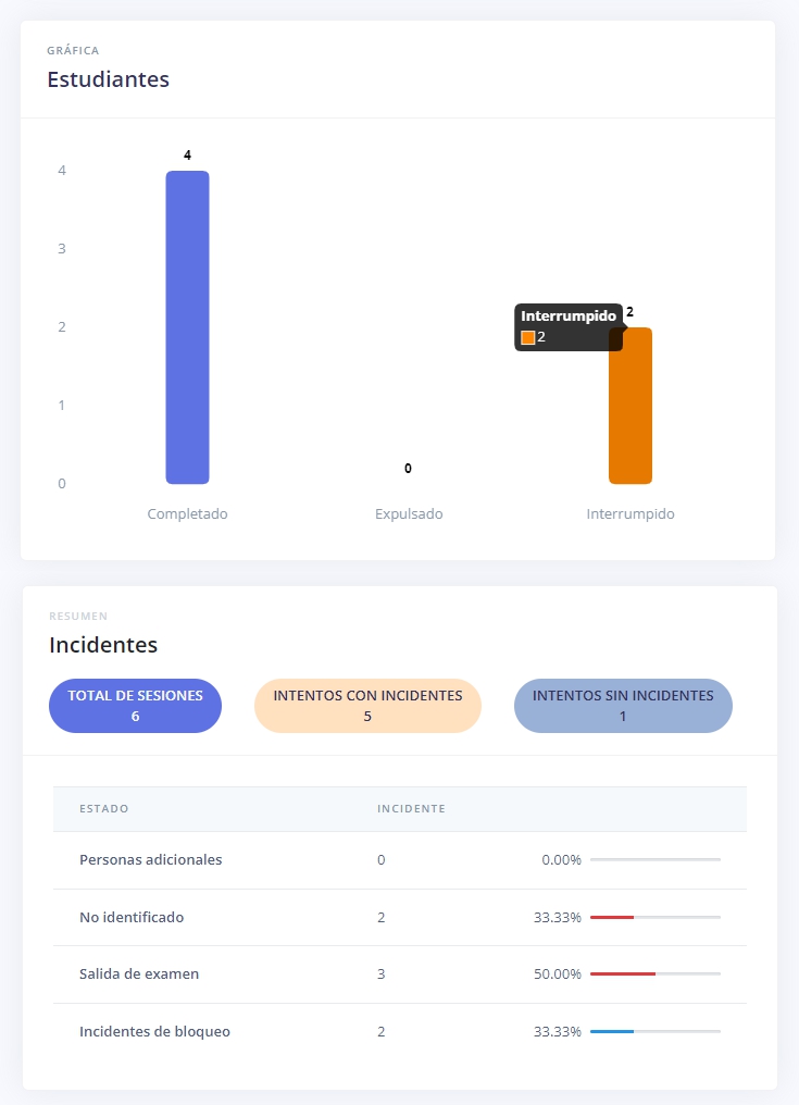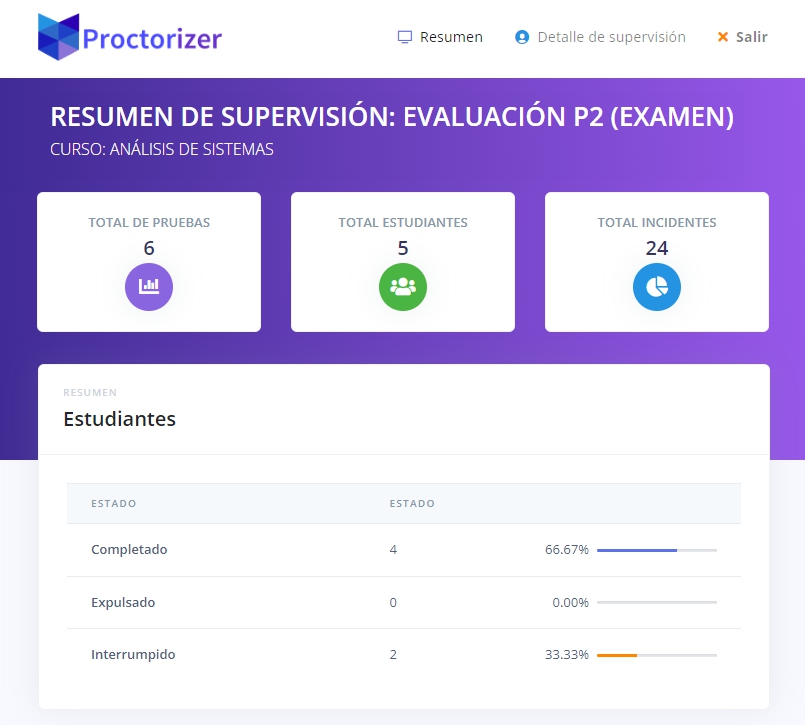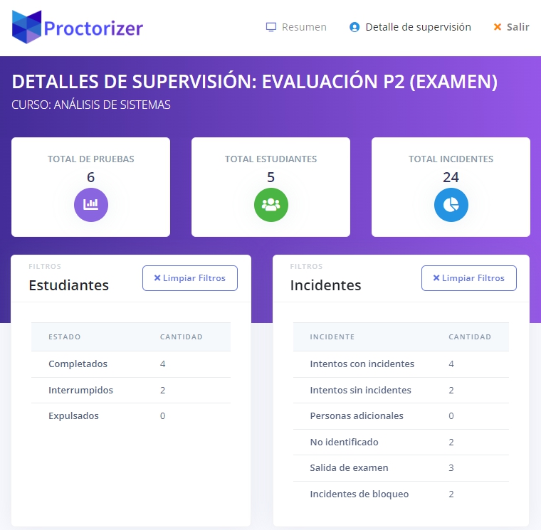 Si la evaluación es supervisada por Proctorizer, se dispondrá de reportes accesibles en la pantalla de seguimiento de la evaluación: