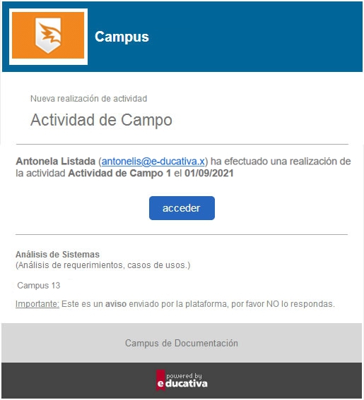 Cuando un usuario cursante hace entrega de la actividad realizada, automáticamente se dispara un email de notificación al correo externo del tutor asignado a la actividad.