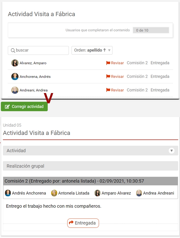 Si se tratara de una actividad grupal la corrección del tutor es realizada en uno de los usuarios del grupo de trabajo con impacto en todos los integrantes del mismo.