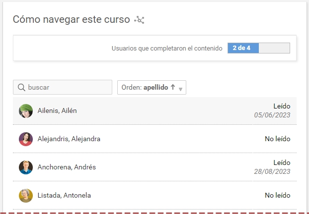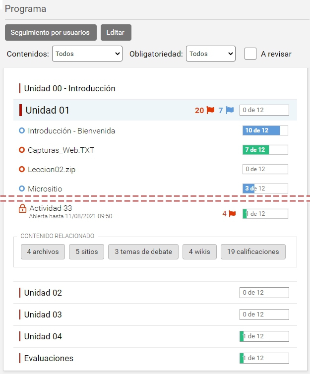 Se dispone de filtros para encontrar ítems puntuales según su tipo de contenido (textos, actividades, encuestas, etc.) y su obligatoriedad.