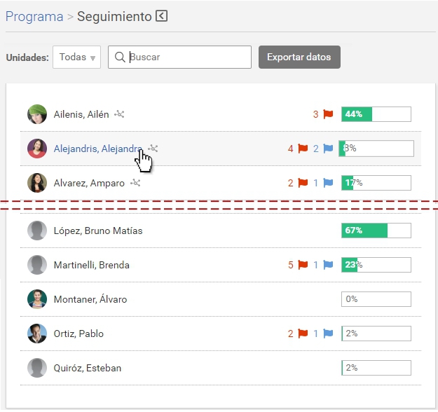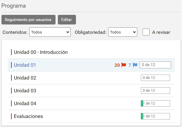 Para realizar el seguimiento de los alumnos o cursantes, se dispone de la vista de seguimiento. Se muestra el listado de los usuarios con permiso "cursa" en Programa, sus necesidades de revisión (banderas) y el porcentaje de avance total del alumno.