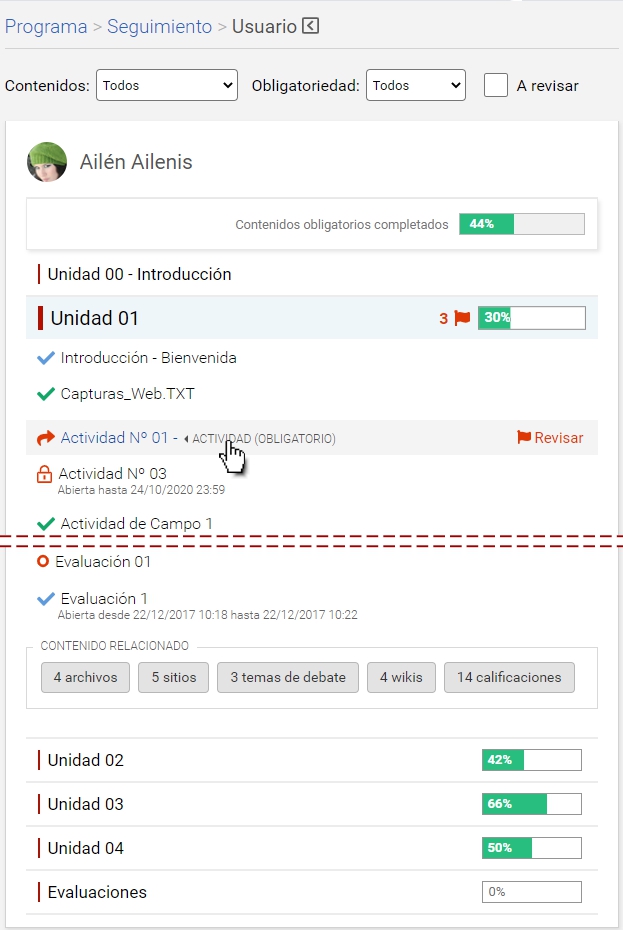 Al hacer clic en un alumno puntual, se despliega su avance en las unidades del curso de la siguiente manera: