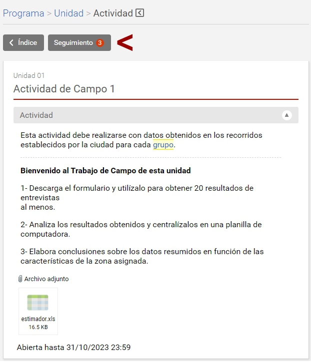Finalmente si hacemos clic en Seguimiento se visualiza la lista de realizaciones para este ítem de los alumnos. Así como las fechas asignadas para su apertura y/o cierre si las hubiera.