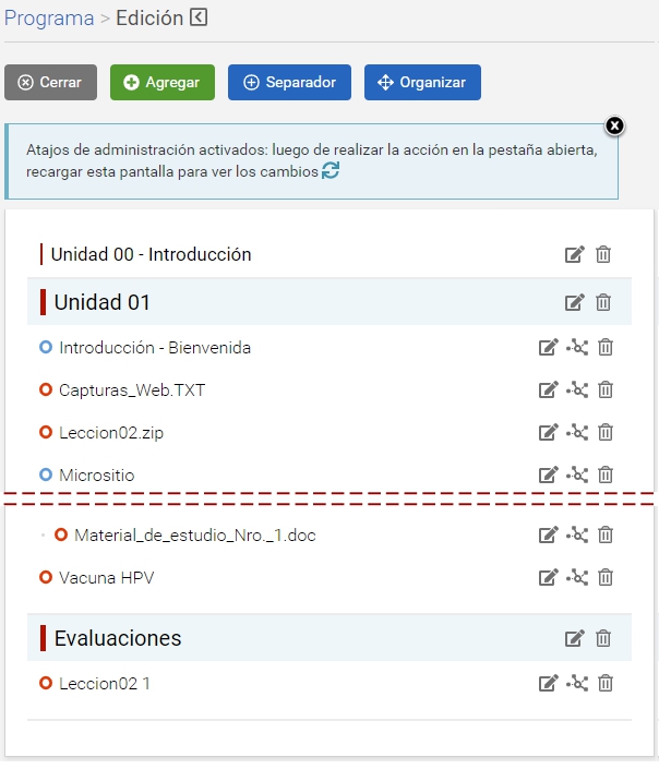 Al hacer clic en Editar, el responsable accede a una pantalla en la cual tiene accesos rápidos para la gestión de los ítems en Programa: