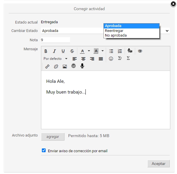 + Aprobada: le dará por aprobado el ítem al alumno y permite colocar una nota. Si la actividad registra calificación, esta información se ve reflejada en la lista correspondiente en al sección Calificaciones.