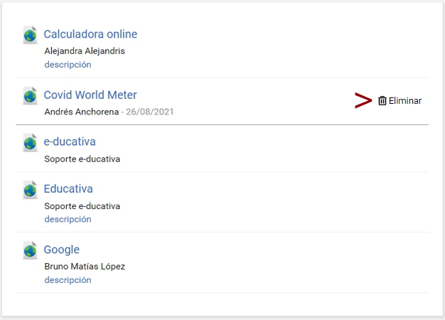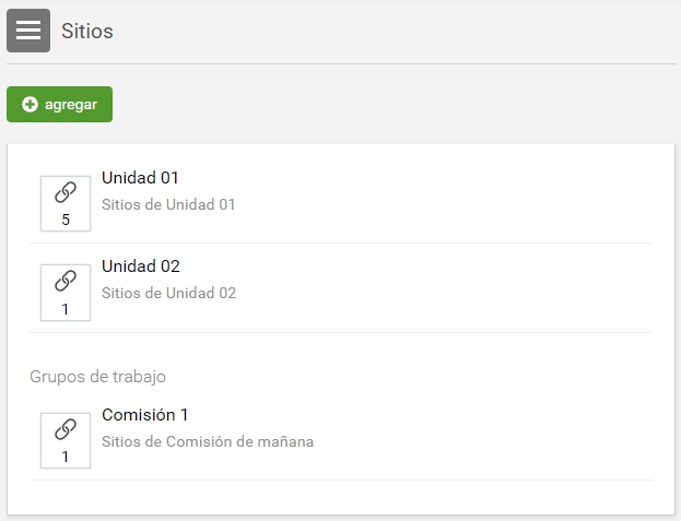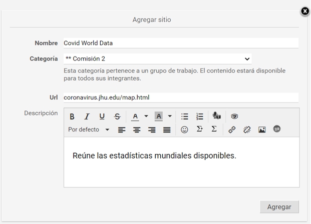 Los sitios son aportados por los distintos miembros del aula. El alta de estos sitios proporciona un rápido acceso a información relacionada con el contenido de la unidad, disminuyendo el tiempo de búsqueda en Internet y permitiendo aprovechar al máximo los sitios recomendados por los demás usuarios.