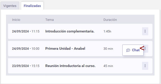 En las reuniones finalizadas se puede visualizar el chat: