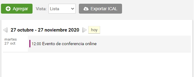SeccionesCalendarioVisualización de Calendario Vista Lista Es posible visualizar un listado de los eventos publicados en un determinado período de tiempo. Dicho período dependerá de la vista previa en la cual esé posicionado el usuario.