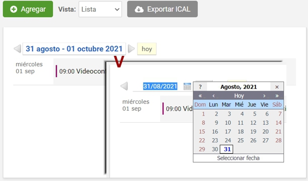En todas las vistas es posible buscar una fecha cualquiera al hacer clic en el período visualizado, por ejemplo en la vista lista: