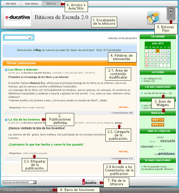 La Bitácora o Blog está conformado por áreas con diferentes funcionalidades. En la imagen diferenciamos estas áreas, utilizando aquí un modelo genérico para fines explicativos.