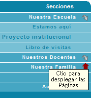 Las secciones, definidas desde la administración, pueden variar su orden, nombre y contenido. En nuestro ejemplo anterior las secciones se visualizan a la izquierda, en una columna. De agregarse más secciones, se mostrarán automáticamente en la lista, en el orden determinado desde la administración. Al hacer clic en la flecha Para visualizar el contenido de una página o sección, sólo debemos hacer clic en su nombre. |