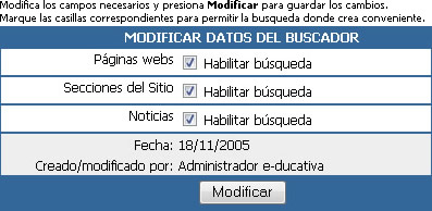 La configuración del buscador es muy simple, solo debemos activar o desactivar las casillas de Páginas Web, Secciones del sitio y Noticias. Esto sirve para que el buscador busque entre las páginas, las secciones y noticias del sitio la palabra que estamos buscando. |
