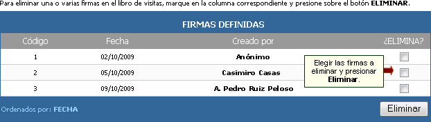 Si lo que se desea es eliminar un mensaje, lo que se debe hacer es hacer clic en Firmas y luego en la opción Eliminar en la barra de comandos, a continuación marcar la casilla del mensaje que se desea borrar y por último hacer clic en el botón Eliminar