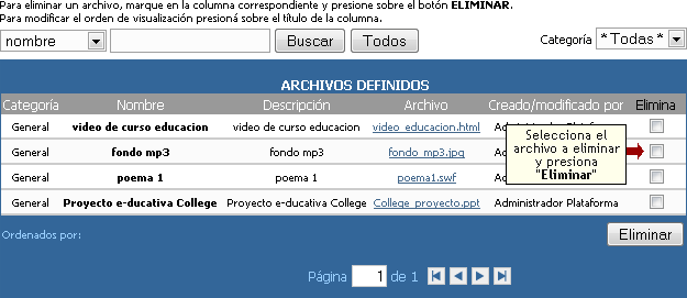 Si lo que se desea es eliminar un archivo, lo que se debe hacer es hacer clic en Uploads y luego en la opción Eliminar en la barra de comandos, a continuación marcar la casilla del archivo que se desea borrar y por último hacer clic en el botón Eliminar.