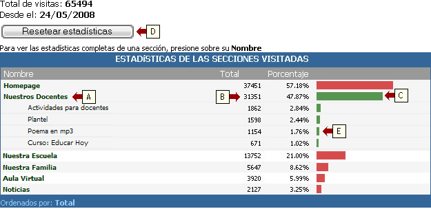 En una primera instancia nos muestra una tabla con las secciones del sitio (A) y el número total de entradas que hubo en cada una (B) y el porcentaje de actividad que posee (C).