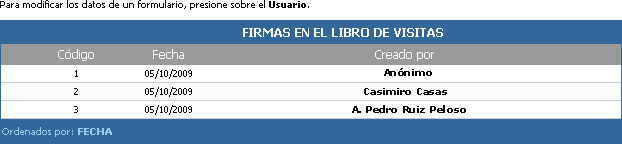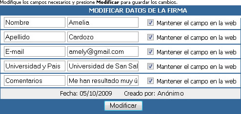 Si seleccionamos la Firma a modificar nos abrirá un formulario como el que sigue: Podemos modificar todos los datos del mensaje e incluso desactivar algún campo que no queremos que aparezca en la página. |