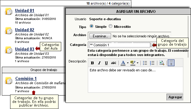 Así si pertenecemos a un Grupo de trabajo, en las secciones donde la tengamos habilitada veremos la categoría correspondiente, y podremos publicar contenidos en ella. Por ejemplo en la sección Archivos, como se muestra en la imagen anterior.