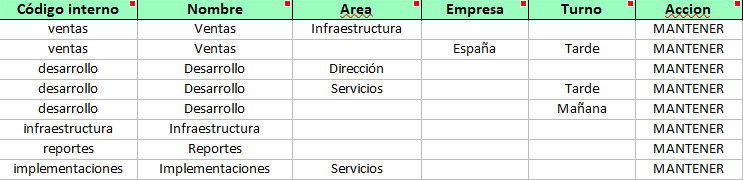 Las reglas para los objetivos que en "Acción" tengan "AGREGAR" serán agregadas como una nueva regla de perfil para los objetivos indicados. Por ejemplo Area "Infraestructura" para el objetivo "Ventas"