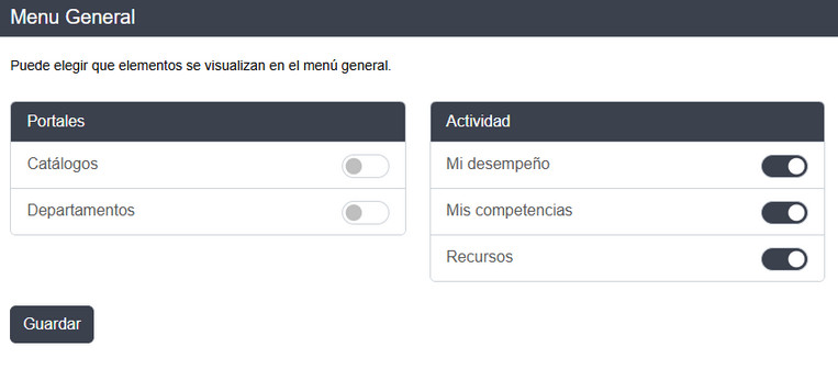 Actividad: Define si se muestran para los usuarios "Mi desempeño", "Mis competencias" Y "Recursos" en el menú del front.