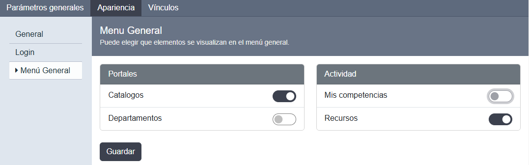 Administración ConfiguraciónApariencia Menú General Se permite configurar la visualización de entradas del Menú General