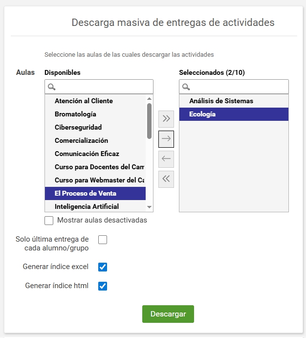 Esta herramienta permite descargar masivamente las entregas de actividades con sus archivos adjuntos organizados por curso, actividad y número de entrega en un archivo ZIP.