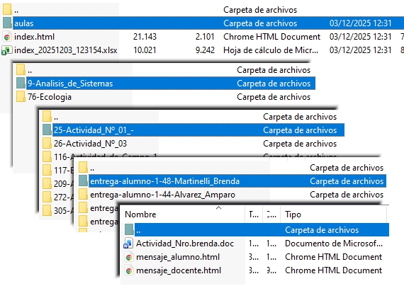 En cada aula se detallan una carpeta por actividad, con la forma <id_actividad>-<nombre_actividad>, por ejemplo: 25-Actividad_Nº_01_-