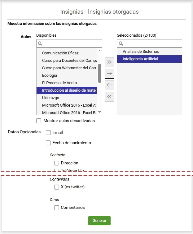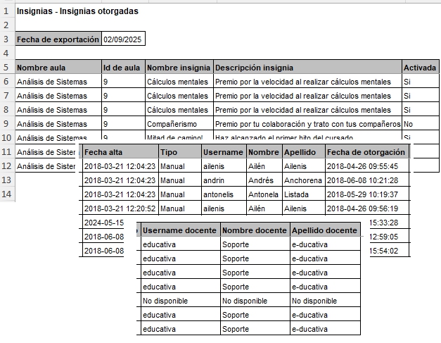En este reporte avanzado se genera una planilla que incluye el listado de insignias otorgadas a los alumnos (pueden visualizarse en la vista de usuario en cada aula).